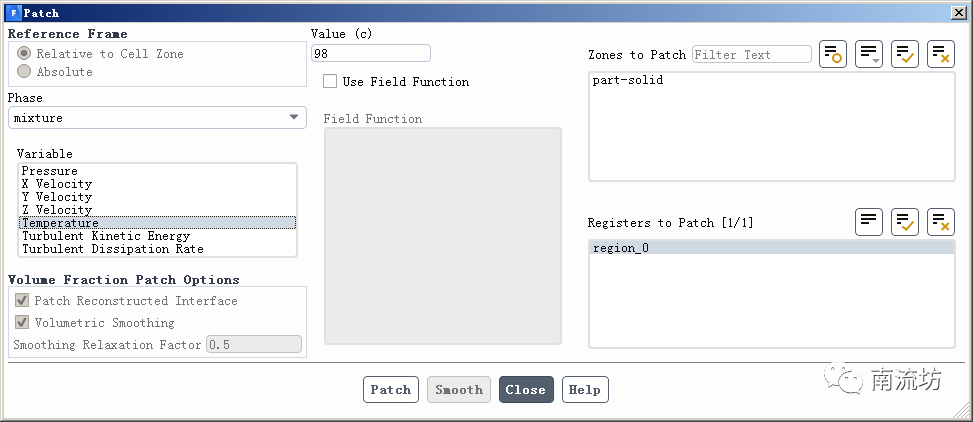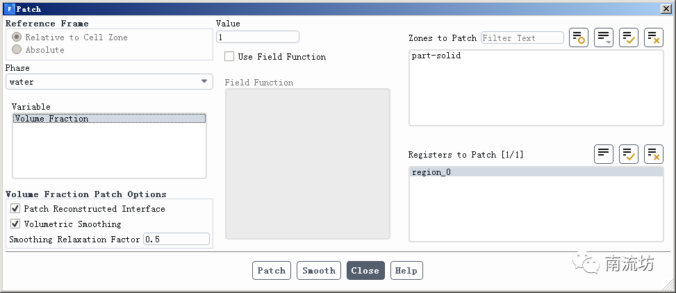 (3)在Solution Initialization(初始化设置)面板中,单击Patch按钮,弹出Patch对话框,在Zone to Patch中选择新建立的水区域,Variable中选择Volume Fraction,在Value中填入0,单击Patch按钮。