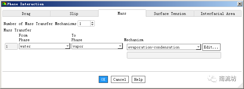 (6)在Phase设定对话框中,双击Interaction按钮,弹出Phase Interaction对话框,在Mass选项卡中,Number of Mass Transfer Mechanisms选择1,在Mechanism中选择evaporation-condensation,单击Edit按钮进入evaporation-condensation model对话框,Saturation Temperature填入100,Evaporation Frequency填入0.2,Condensation Frequency填入0.1,单击OK按钮确认。