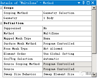 (3)右键单击模型树中Mesh选项,依次选择Mesh→Insert→Method。MEthod选择MultiZone。