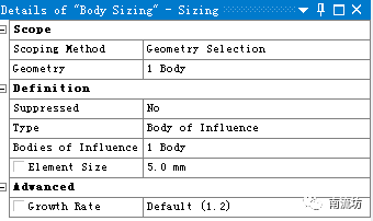 (4)右键单击模型树中Mesh选项,依次选择Mesh→Insert→Sizing。Type选择Body of Influence,Element size填入5mm。