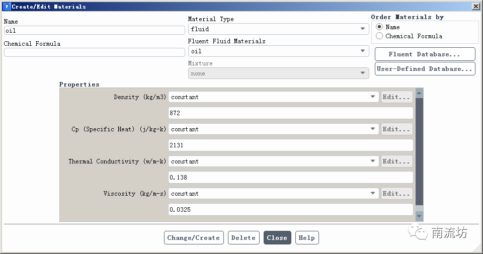 (2)创建新物质oil。density输入872,Cp输入2131,Viscosity输入0.0325。