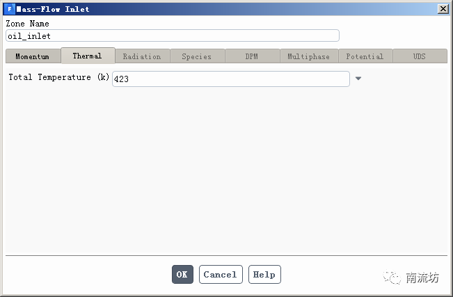 (3)同步骤(2)设置oil inlet,Mass flow rate输入0.01,在Thermal选项卡中,Temperature输入423,单击OK按钮确认退出。