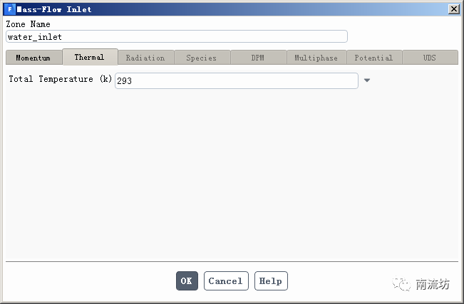 (2)在边界条件面板中,设置water inlet的边界类型为mass-flow inlet,Mass flow rate输入0.3,在Thermal选项卡中,Temperature输入293,单击OK按钮确认退出。