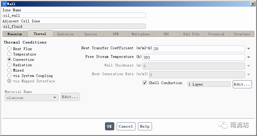 (5)在边界条件面板中,设置oil wall,Thermal Conditions选择Convection,Heat Transfer Coefficient输入20,Free Steam Temperature输入303,勾选Shell Conduction,Wall Thickness输入0.001,单击OK按钮确认退出。