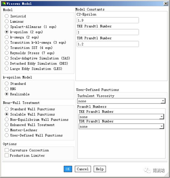(4)在模型设定面板Models中双击Viscous按钮,弹出Viscous Model(湍流模型)对话框,在Model中选择Realizable k-epsilon(2eqn),在Near-Wall Treatment中选择Scalable Wall Functions,单击OK按钮确认并关闭对话框。