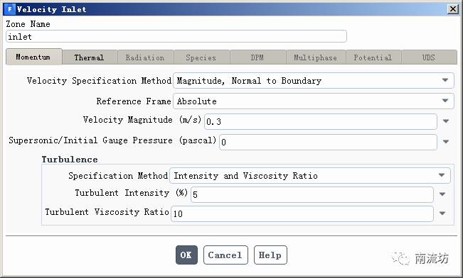(2)在边界条件面板中,双击inlet弹出边界条件设置对话框。Velocity Magnitude输入0.3,Temperature输入310,单击OK按钮确认退出。
