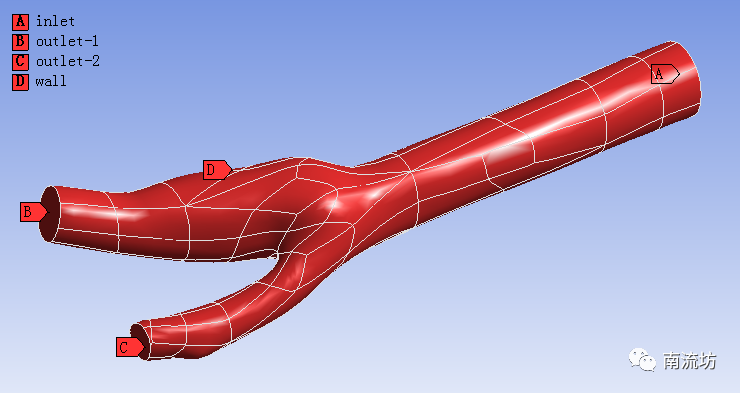 (2)分别右键选择管道入口和出口,在弹出快捷菜单中选择Create Named Selection,弹出Selection Name对话框,输入名称inlet,outlet-1,outlet-2和wall,单击OK按钮确认。
