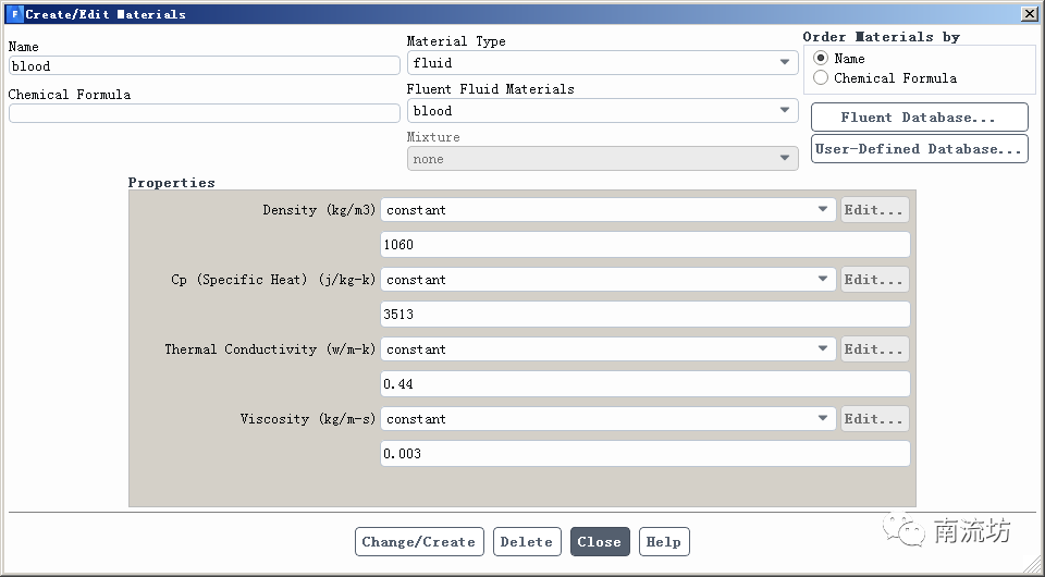 (2)单击主菜单中Setting Up Physics→Materials→Create/Edit,弹出Create/Edit Materials(材料)对话框。设置新物质blood,density填入1060,Cp填入3513,Thermal Conductivity填入0.44,Viscosity填入0.003,单击Change/Create按钮确认。