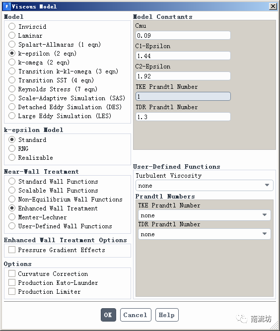 (1)在模型设定面板Models中双击Viscous按钮,弹出Viscous Models对话框,勾选k-epsilon模型。
