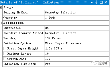 (3)在Mesh中Insert→Inflation,boundary选择机器壁面,Inflation Option选择First Layer Thickness,填入2.5e-5。