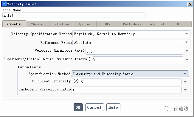 (2)在边界条件面板中,双击inlet弹出边界条件设置对话框。在Velocity Magnitude中输入0.5,单击OK按钮确认退出。