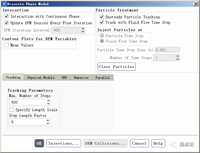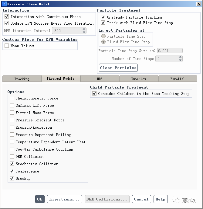 (1)在模型设定面板Models中双击Discrete Phase按钮,弹出Discrete Phase(离散相模型)对话框,选择Interaction with Continuous Phases,在Physical Models选项卡中勾选Stochastic Collision,Coalescence和Breakup。