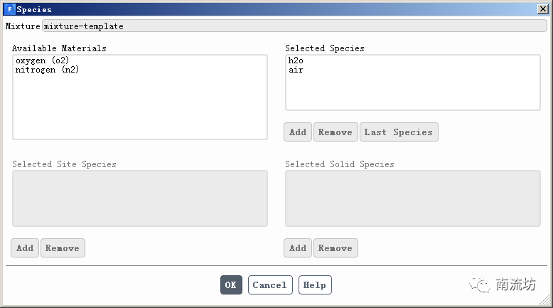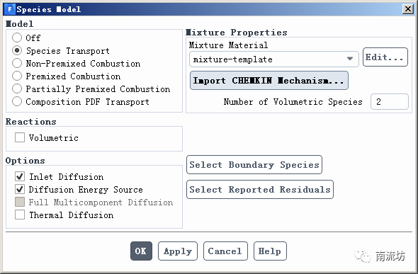 (1)在模型设定面板Models中双击Species按钮,弹出Species Model(组分输运模型 )对话框,选择Species Transport,勾选Inlet Diffusion和Diffusion Energy Source,单击OK按钮确认并关闭对话框。