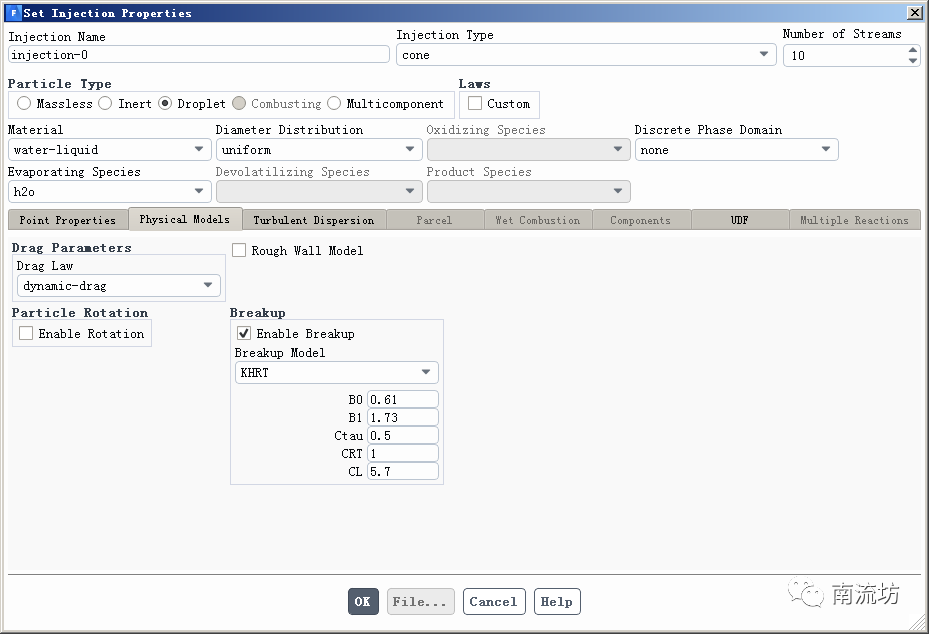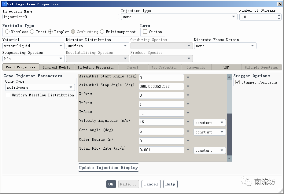 (2)单击Injections按钮,弹出Injections对话框,单击Create按钮创建入射粒子,Injection Type选择cone,Number of Streams填入10,Particle Type选择Droplet,Material选择Water-liquid,Cone Type选择solid-cone,填入入射粒子位置及流速、流量数据。