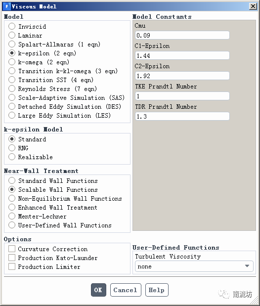 (1)在模型设定面板Models中双击Viscous按钮,弹出Viscous Models对话框,勾选k-epsilon模型。