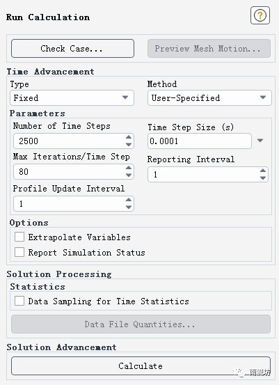 在Time Step Size填入0.0001,Number of Iterations中输入2500,单击Calculate开始计算。
