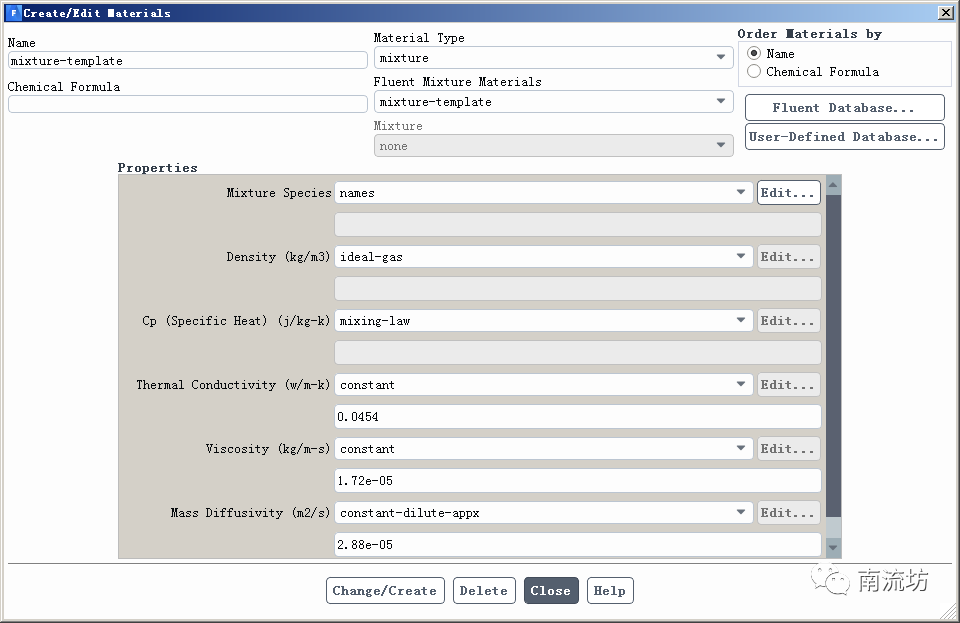 (1)单击主菜单中Setting Up Physics→Materials→Create/Edit,弹出Create/Edit Materials(材料)对话框。设置混合物density为ideal-gas,混合物组分为air和水蒸气。