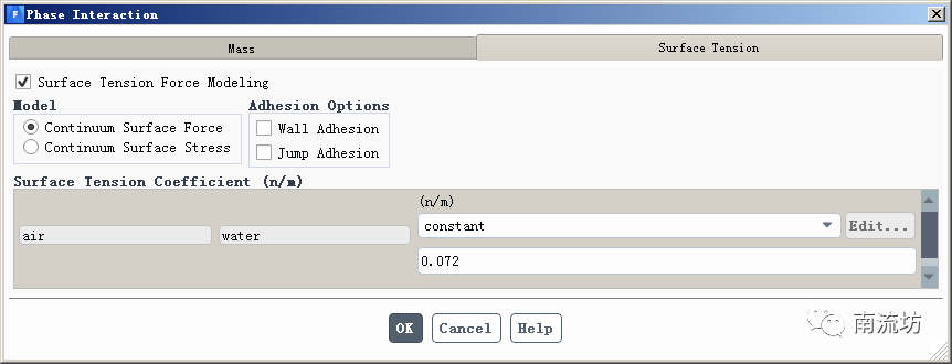 (3)在模型设定面板Models中双击Multiphase下的Phases Interactions按钮,弹出Phase Interactions对话框,勾选Surface Tension Force Modeling,Surface Tension Coefficient输入0.072,单击OK按钮确认并关闭对话框。
