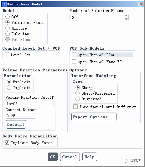 (1)在模型设定面板Models中双击Multiphase按钮,弹出Multiphase Model(多相流模型)对话框,选择VOF,Number of Eulerian Phases填入2,勾选Impicit Body Force,单击OK按钮确认并关闭对话框。
