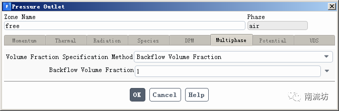 (3)设置free的边界类型为pressure-outlet,设置air相的体积百分比为1。