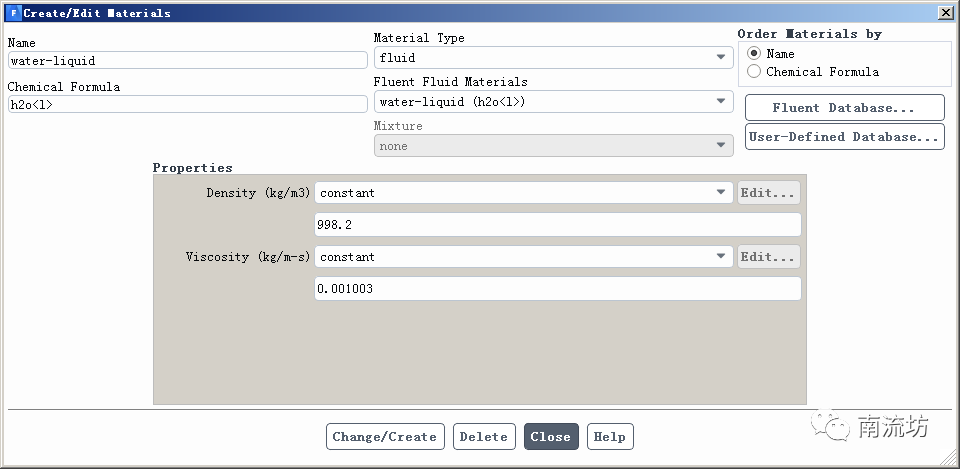 (1)单击主菜单中Setting Up Physics→Materials→Create/Edit,弹出Create/Edit Materials(材料)对话框。单击Fluent Database按钮弹出Fluent Database Materials对话框,选择water-liquid单击Copy按钮确认。
