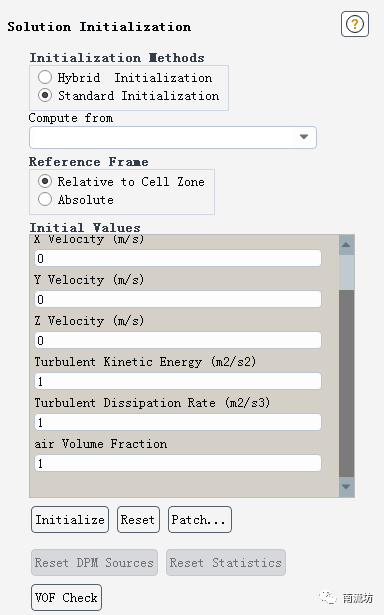 Initialization Methods中选择Standard Initialization,设置air相的体积百分比为1,单击Initialize按钮进行初始化。