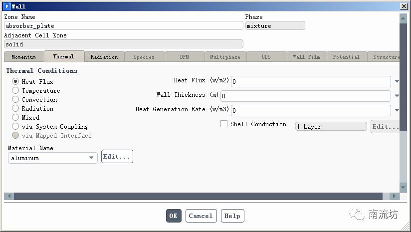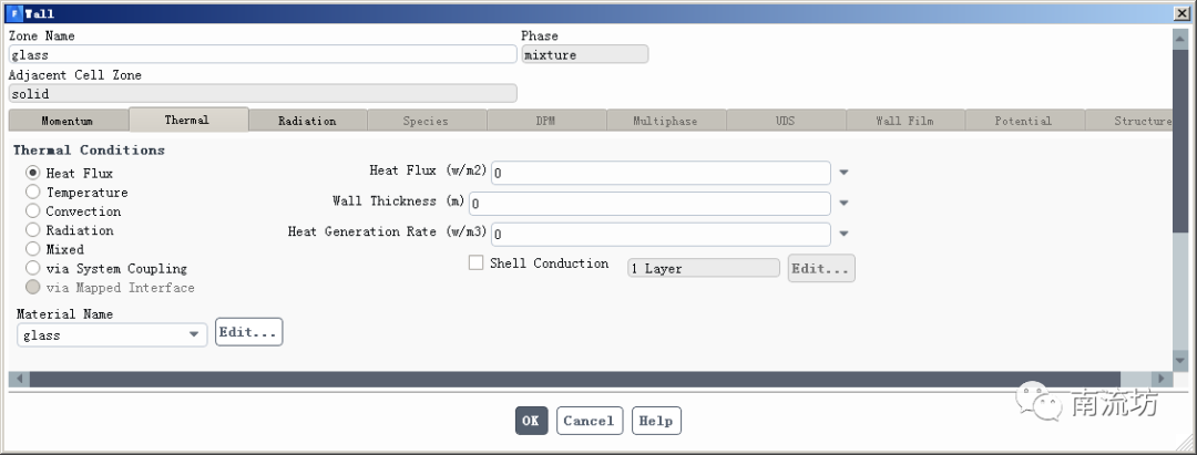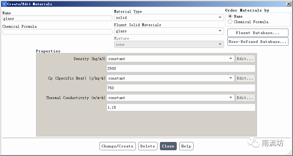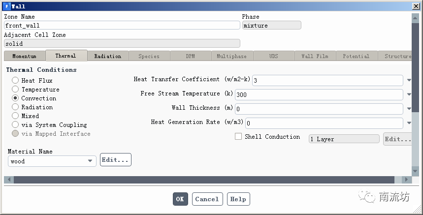 (2)在材料库中选择导入固体物质wood,同时创建新固体物质glass。glass的density填入2500,Cp填入750,Thermal Conductivity填入1.15。