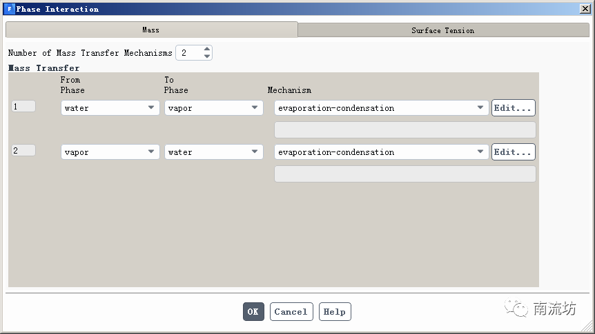 (3)在模型设定面板Models中双击Multiphase下的Phases Interactions按钮,弹出Phase Interactions对话框,在Mass选项卡中,Number of Mass Transfer Mechanisms填入2,分别设置from phase water,to phase vapor和 from phase vapor,to phase water,Mechanism均选择为evaporation-condensation。