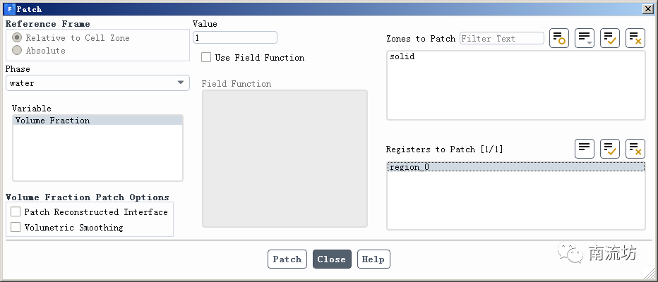 (3)在Solution Initialization(初始化设置)面板中,单击Patch按钮,弹出Patch对话框,在Zone to Patch中选择新建立的水区域,Variable中选择Volume Fraction,在Value中填入1,单击Patch按钮。