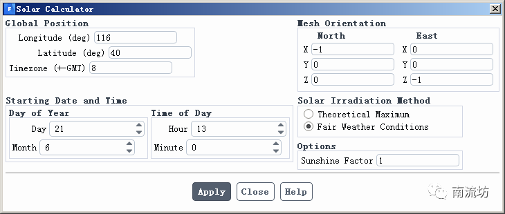 单击Solar Calculation按钮,弹出Solar Calculation对话框,输入所在地时区、经纬度、时间和模型所处的方位信息。