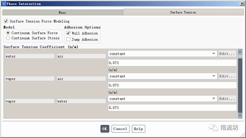 (4)在Surface Tension选项卡中,勾选Surface Tension Force Modeling和Wall Adhesion,Surface Tension Coefficient输入0.073,单击OK按钮确认并关闭对话框。