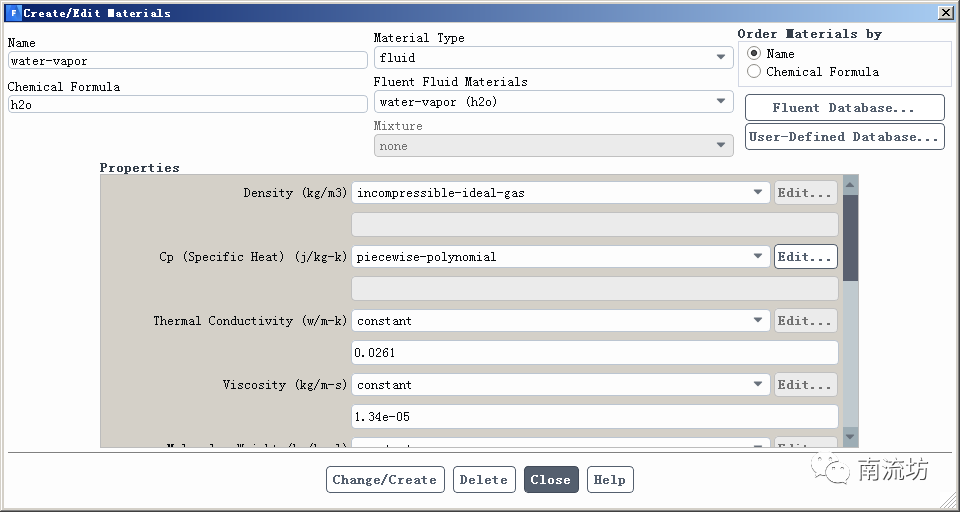 (1)单击主菜单中Setting Up Physics→Materials→Create/Edit,弹出Create/Edit Materials(材料)对话框。在材料库中选择导入water-liquid和water-vapor。