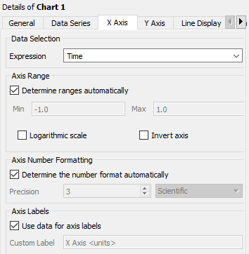 进入X Axis标签页,可以看到软件自动选择了X坐标为Time