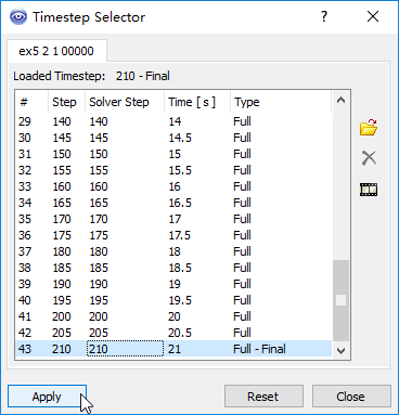 在Timesteps Selector对话框中,选择时间为21s时刻,如下图所示,点击Apply按钮导入数据