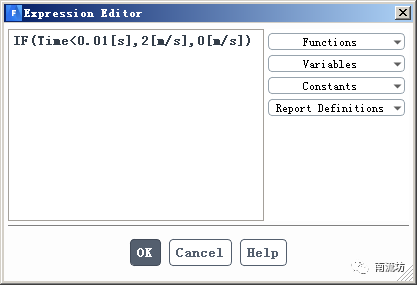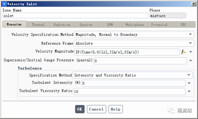 (2)在边界条件面板中,双击inlet弹出边界条件设置对话框。在Velocity Magnitude中输入变量Expression“IF(Time<0.01[s],2[m/s],0[m/s])”,单击OK按钮确认退出。