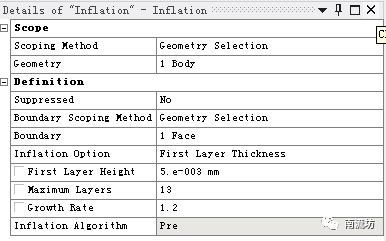 (5)设置边界层。在Mesh中Insert→Inflation,选择bottom边界,Inflation Option选择First Layer Thickness,First Layer Height输入5e-3。