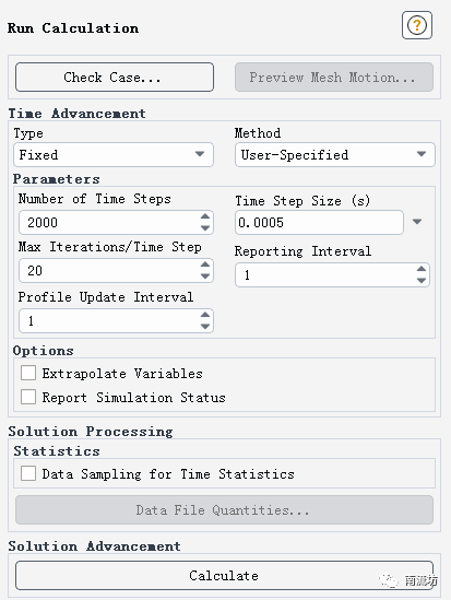 在Time Step Size填入5.0e-4,Number of Iterations中输入2000,单击Calculate开始计算。