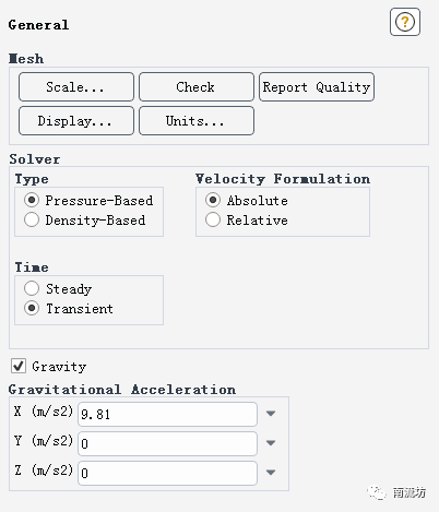 (2)单击命令结构树中General按钮,弹出General(总体模型设定)面板,Solver中Time选择Transient。勾选Gravity,在X中填入9.81m/s2。