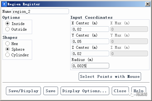(2)单击主菜单中Domain→Adapt→Refine按钮,弹出Adaption Controls对话框,单击Cell Registers→New→Region按钮,弹出Region Register对话框,设置5mm直径的水滴球体区域。