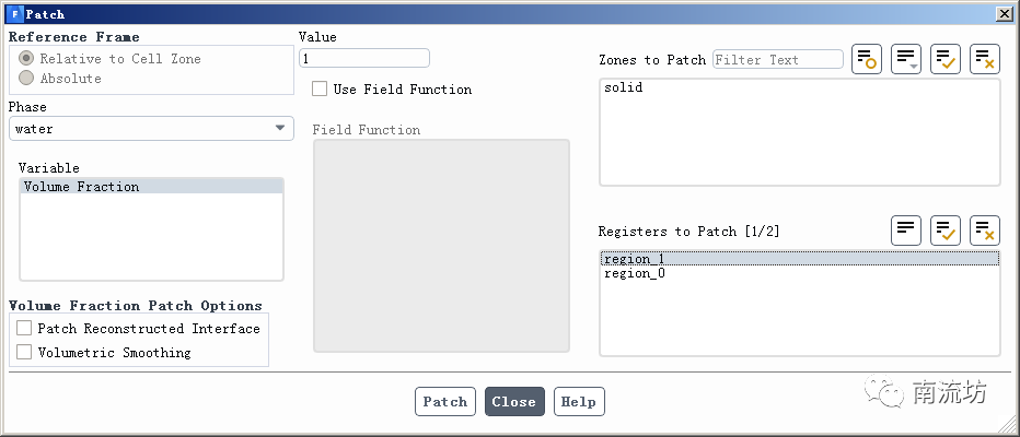 (3)在Solution Initialization(初始化设置)面板中,单击Patch按钮,弹出Patch对话框,在Zone to Patch中选择新建立的水滴区域,Variable中选择Volume Fraction,在Value中填入1,单击Patch按钮。