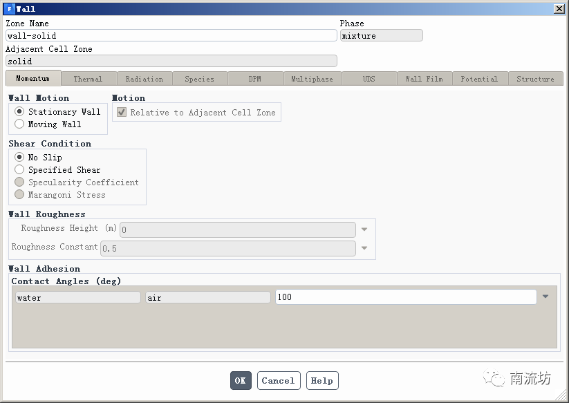 (2)在边界条件面板中,双击wall弹出边界条件设置对话框。在Contact Angles输入100,单击OK按钮确认退出。