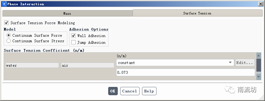 (3)在模型设定面板Models中双击Multiphase下的Phases Interactions按钮,弹出Phase Interactions对话框,勾选Surface Tension Force Modeling和Wall Adhesion,Surface Tension Coefficient输入0.073,单击OK按钮确认并关闭对话框。