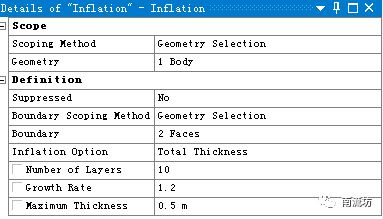 (3)在水槽底面设置边界层。在Inflation Option中选择Total Thickness,Number of Layers填入10,Maximum Thickness填入0.5.