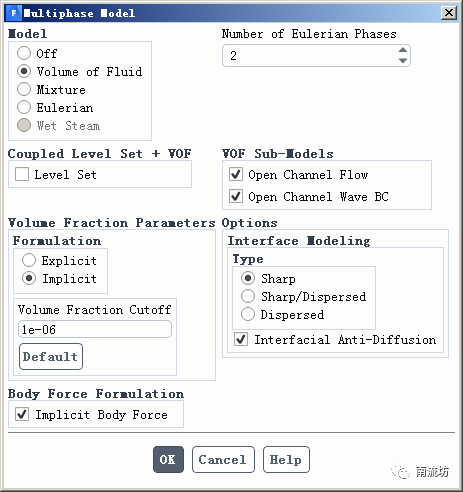 (1)在模型设定面板Models中双击Multiphase按钮,弹出Multiphase Model(多相流模型)对话框,选择VOF,Number of Eulerian Phases填入2,勾选Open Channel Flow和Open Channel Wave BC,单击OK按钮确认并关闭对话框。