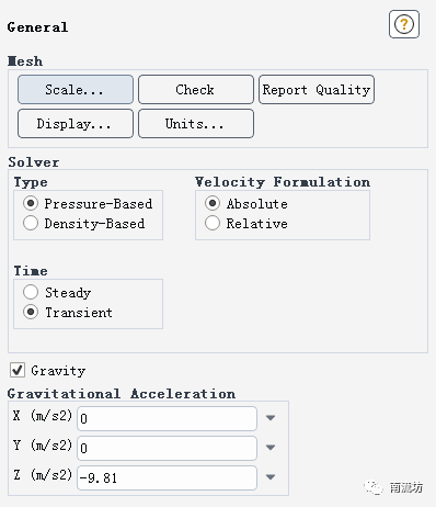(2)单击命令结构树中General按钮,弹出General(总体模型设定)面板,Solver中Time选择Transient。勾选Gravity,在Z中填入-9.81m/s2。