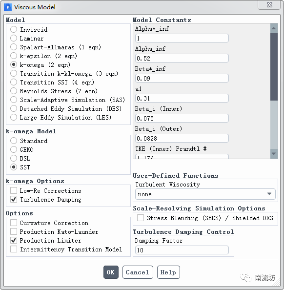 (3)在湍流模型设置面板,选择SST k-omega模型,勾选Turbulence Damping。