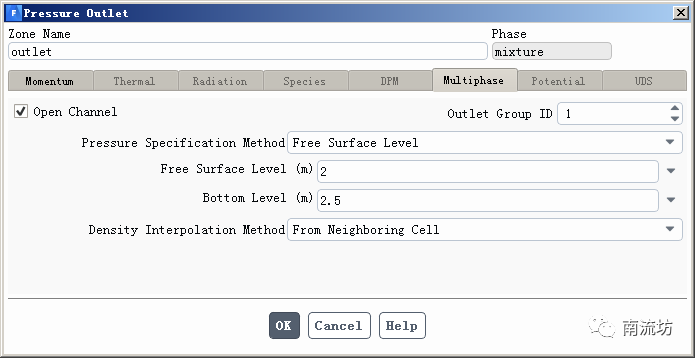 (2)在边界条件面板中,选择outlet的边界类型为pressure-outlet,在Multiphase选项卡中,勾选Open Channel,Free Surface Level输入2,Bottom Level输入2.5。
