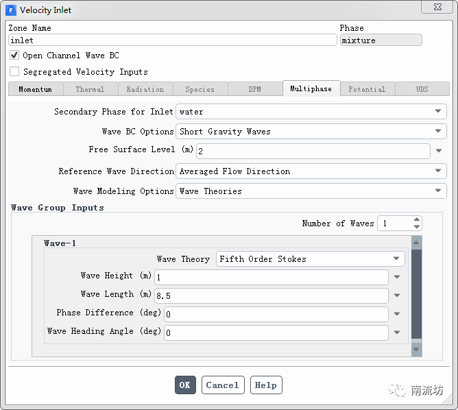 (3)在边界条件面板中,双击inlet弹出边界条件设置对话框。在Multiphase选项卡中,勾选Open Channel Wave BC,Wave BC Options选择Short Gravity Waves,Free Surface Level输入2,Wave Theory选择Fifth Order Stokes,Wave Height输入1,Wave Length输入8.5。