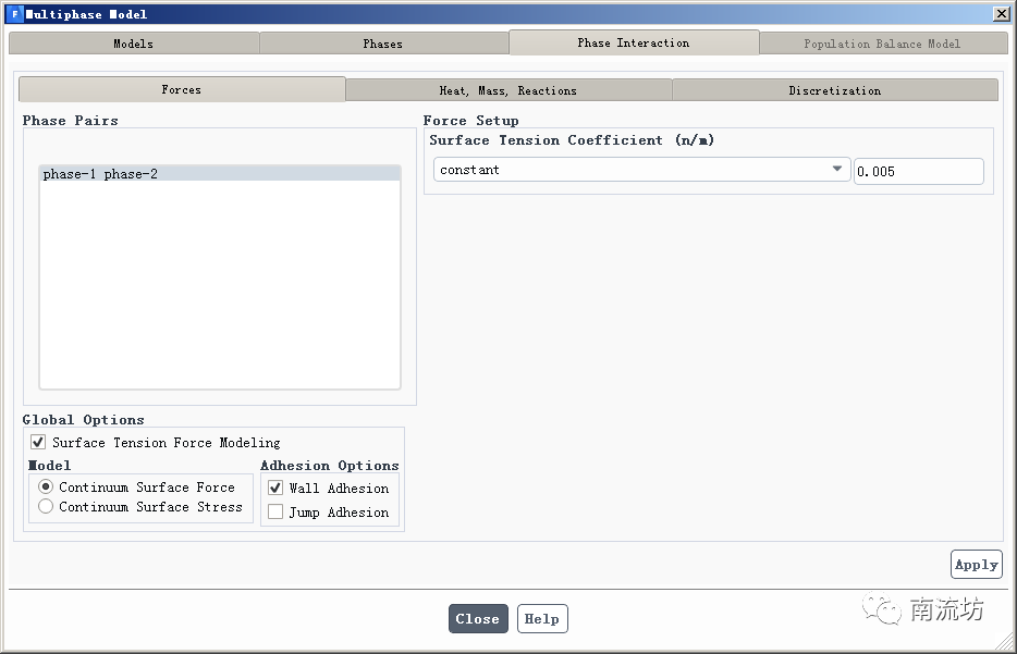 (4)在Phases Interfaction选项卡中,勾选Surface Tension Force Modeling,勾选Wall Adhesion,Surface Tension Coefficient选择constant,填入0.005,单击close关闭窗口。