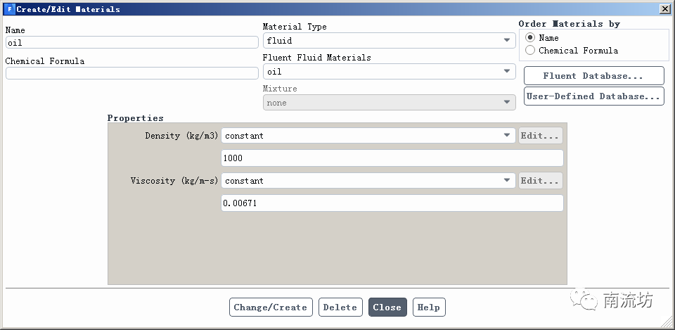 (3)创建新物质oil,density设为1000,viscosity设为0.00671。